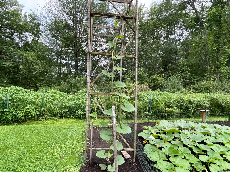 The long gourds are quickly climbing the 14.5 foot trellis with the 149 Jutras leading the 159 Jutras. The 149 is a little over 10 feet and the 159 is around 7.