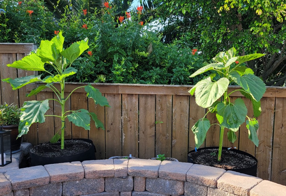 Those yellow spots on the wide sunflower leaf tips in my previous post haven't progressed any further. I've back off on the 10-52-10 a bit and watering less, now only watering at the first sign of leaf droop. Plants are looking very healthy other than some lower leaf damage due to hungry/thirsty finches.