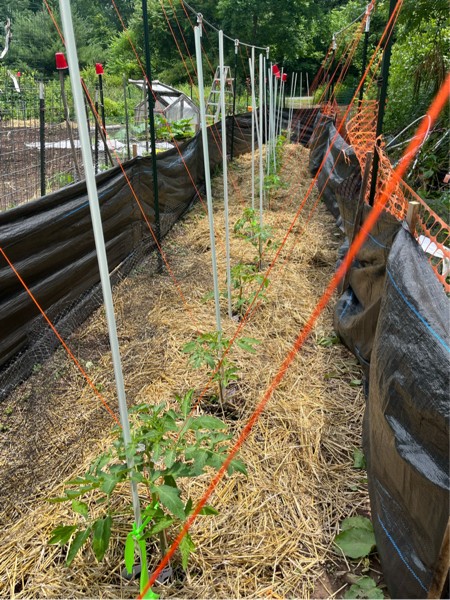 My tomato project is in full swing with the string in place and the plants are starting to thicken up and are growing.