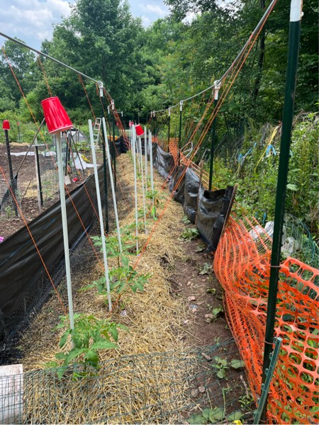 40 mile an hour winds yesterday had the pumpkin plants in jeopardy so I added a little protection for the tomatoes with the silt fence. So far it looks like they all survived.