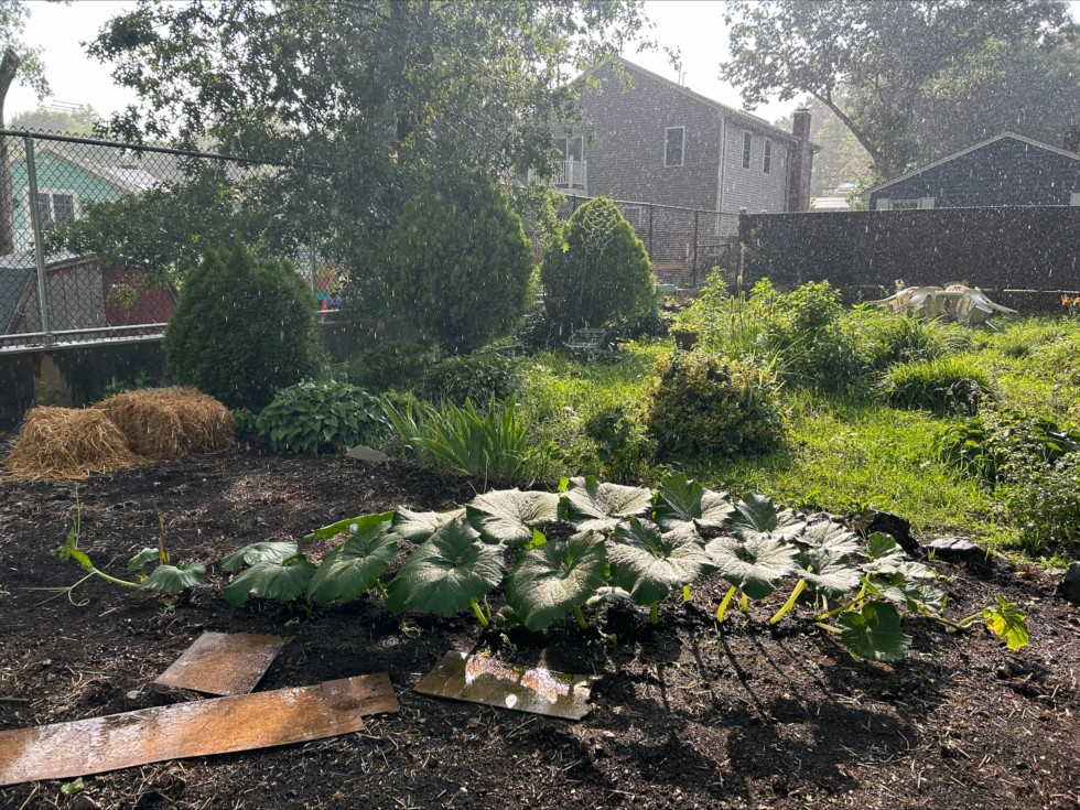 We got caught in rain storm and then it turned into a sun shower. Very isolated. When we got back to our neck in the woods in Boston it was dry. But at night storms raced up the Mass Pike and we got hit hard. Checked on the plants on Thursday and everything was okay.