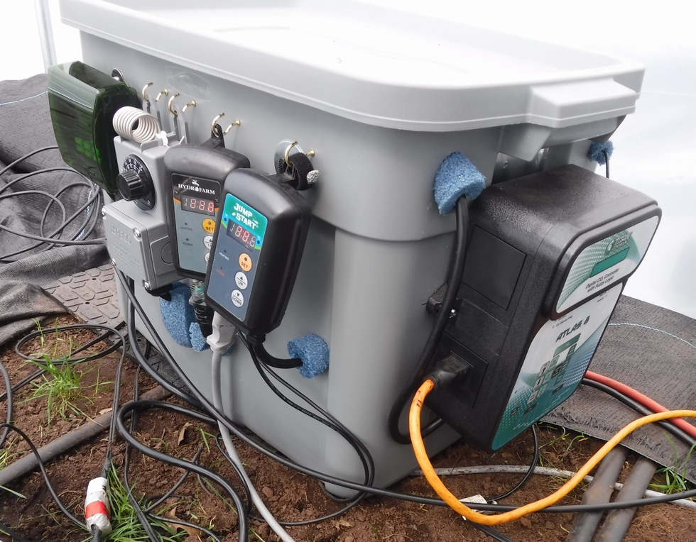 In an effort to keep things organized (controllers and cords) a large heavy duty plastic tote was purchased and the controllers were attached to the outside for easy reading of conditions. This also allowed the inside to contain all of the cords and the lid kept the area sealed off. While the total inside volume was not needed the height was especially for the CO2 controller.