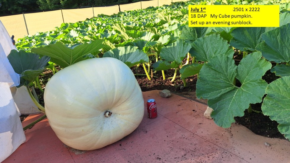 My cube pumpkin! The 2501 Bernstrom x 2222 Gienger cross looks OK. Shown at 18 DAP. This pumpkin gets a lot of hot, evening sun, so I built a Sun shade (shown on left)