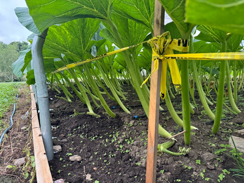 Using the caution tape to hold up the leaves off the rollup sides so they don't get damage. Mr. Jutras stopped by and gave me the idea. Thanks, Joe.