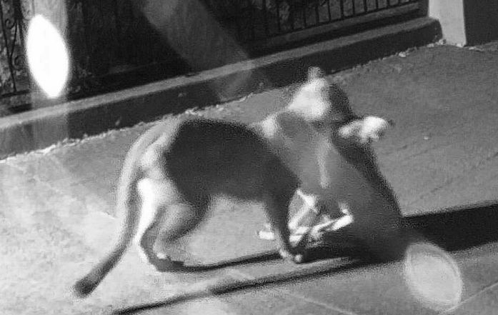 Venison Takeout � My backyard buddy, Leo the Lion, culls the herd...