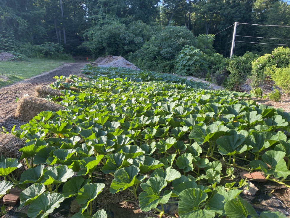 The pumpkins have just about filled in all their space about 700 ft.� per plant. I have three plants in this photo a 1904 Sperry, which is the runt of the patch it has been slow since day one when it took three weeks to germinate. When it finally did germinate, I had to put it on life support as one of the Cotyledon leaves was half rotten but I babied it because I really liked this seed and love to grow orange. it won't disappoint by the looks of it! I think it's going to be a good pumpkin, even though the vines are small like cucumber vines it is growing a big pumpkin very quickly. The 1908. Connolly is the middle plant it has a nice looking pumpkin around 100 pounds. The plant in the foreground is the 1570 Ciesielski it also has a nice pumpkin that looks like it will be orange around 100 pounds.