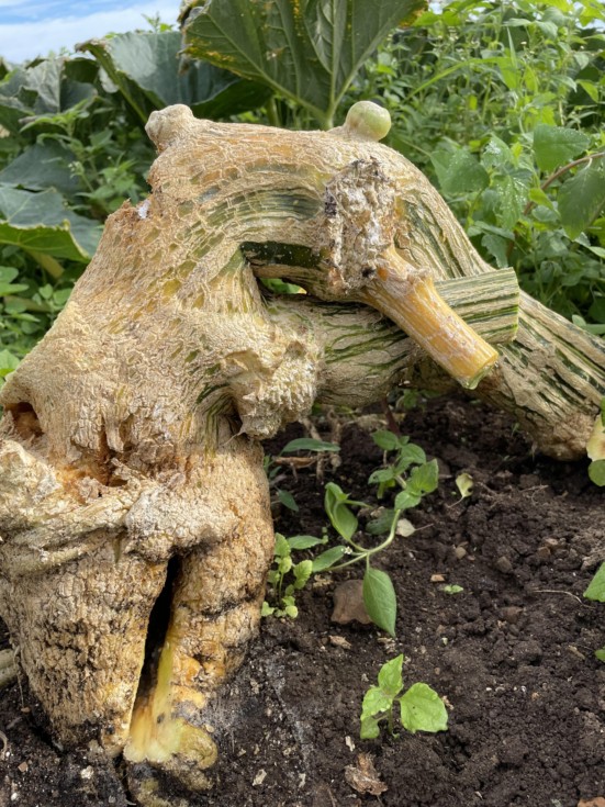 The first few plants I grew went down to foamy stump. In fact my largest pumpkin to date, i.e. 1100 Lb. was grown on what was left of a foamy I amputated mid season. All of these plant were initial installed straight up in the ground and all ended up with some sort of rainbow, rollercoaster, or pea trap stump/crown. Last year I had four plants in the ground which all did well for most of the season but were killed by either residual use of round up, (operator error) or herbicide drift from the adjacent corn field. Even so, none had a foamy stump. Why? Well, I believe its because I put the young plants in the ground on an angle. I hadn't done that before, not thinking it was important. Doing so caused on the main vines to lay down virtually flat. Since I plant on slight mound that meant all of the excess water that might sit in a rainbow stump gravitates downward. I personally believe this remedies the foam stump problem. We'll see. The photo here is of a 2021 foamy from one of pee trap vines. Lost a nice 2365, 440 lb. pumpkin that year.
