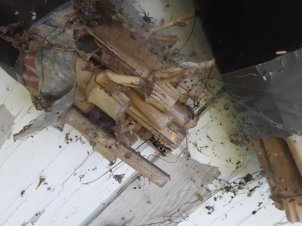 Is this a new species...? I dont know if u can see it but there is a solitary hornet (spider is just photobombing). There are some solitary hornets coming and going here from the old solitary bee nests. I saw one drag a caterpillar into one of the small bamboo tube, so they're definitely not bees. An internet search for "solitary hornet" didnt reveal anything. I dont think these little guys are behaving like wasps. They look, and are behaving, like hornets.