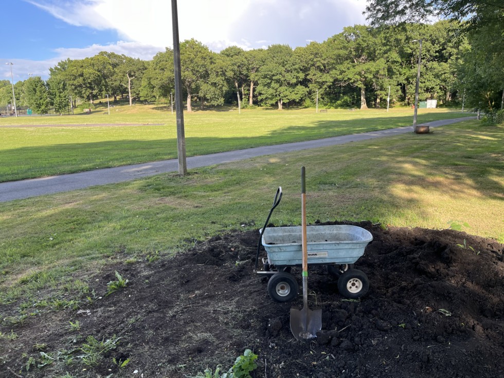 Burying vines now with compost provided by Boston Parks.