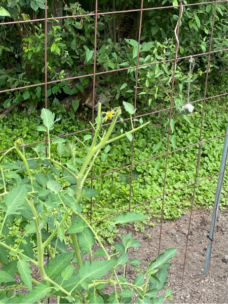 I want to dispel the myth that Irish Spring soap deters deer. Note the pice of soap hanging from the fencing next to the chewed up tomato plant.