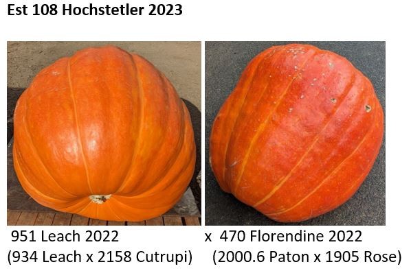 I have 2 162 Toboyek plants. One was pollinated with the 632 Hochstetler (my daughters 150 sq. ft. pumpkin which was 1120 Wolf x 2045 Daho) . This one was pollinated with seeds from a cross I made last year with big and orange potential. The image shows pumpkins grown from both parents of the seed.