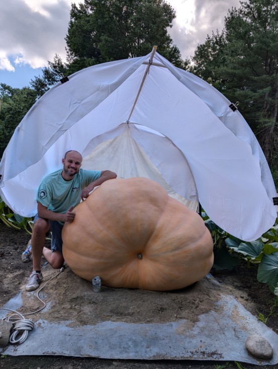 The pumpkins are doing well I think. Growth has slowed down a little - hopefully only because it was quite hot all week. Thunder Shark is in the lead, but has a 10 day head start. The plants are looking nice too. Leaves are mostly in nice condition apart from some aging in the center and on the big first-terminated secondaries. Thunder Shark (1832.5 x self pollinated) is 45 days old. Estimated weight 1170 lbs (532kg). Average gain per day over last 5 days: 41.4 lbs per day (18.8kg). Stem splits are healing well.