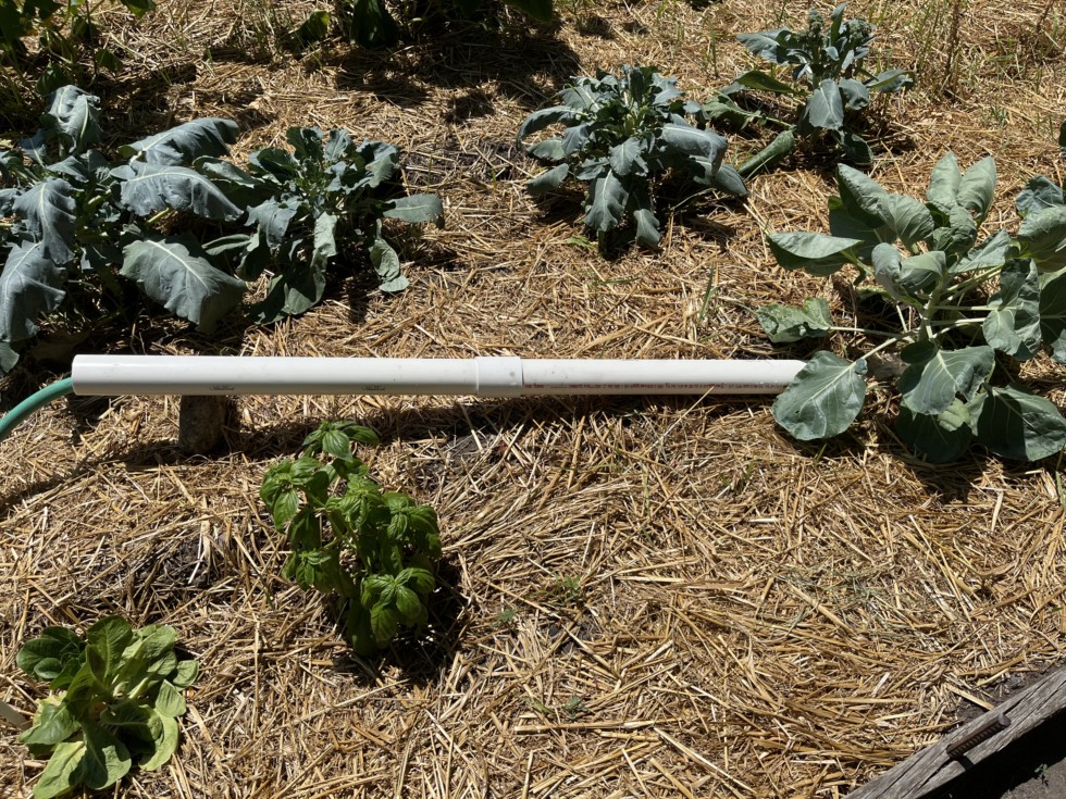High tech watering system for the trenches. PVC pipe and a rock. This allows us to work on other things while the trenches are filling.