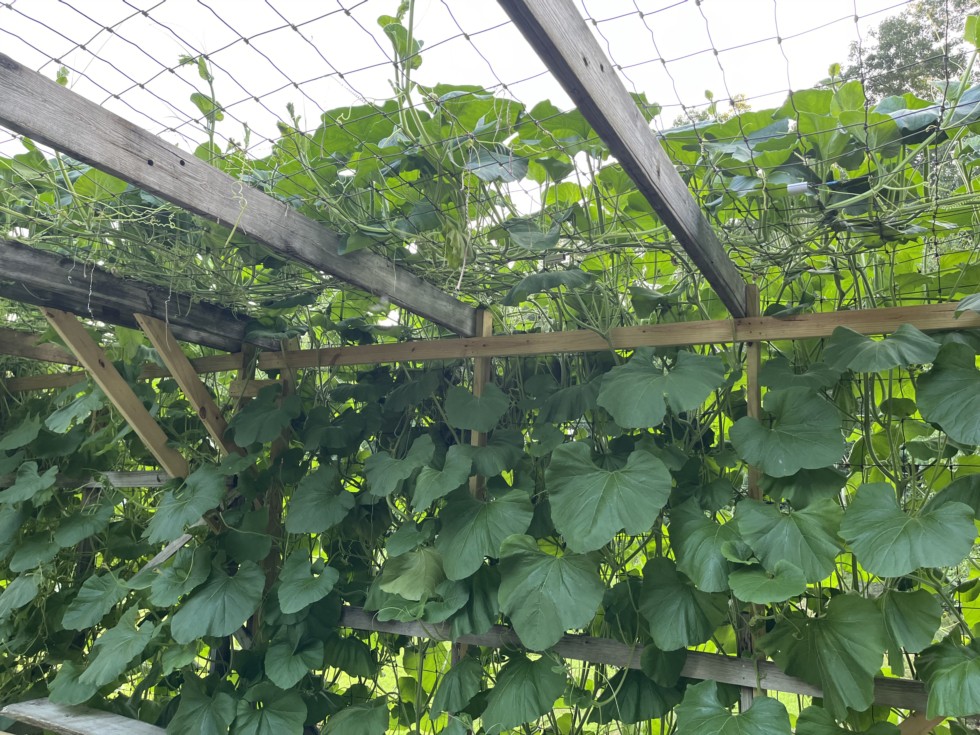 Long gourds I cut six ft off them last week you would never know it still to early. There growing like a weed with this heat we're having. Go to take some work knowing what plant is being pollinated with what plant.