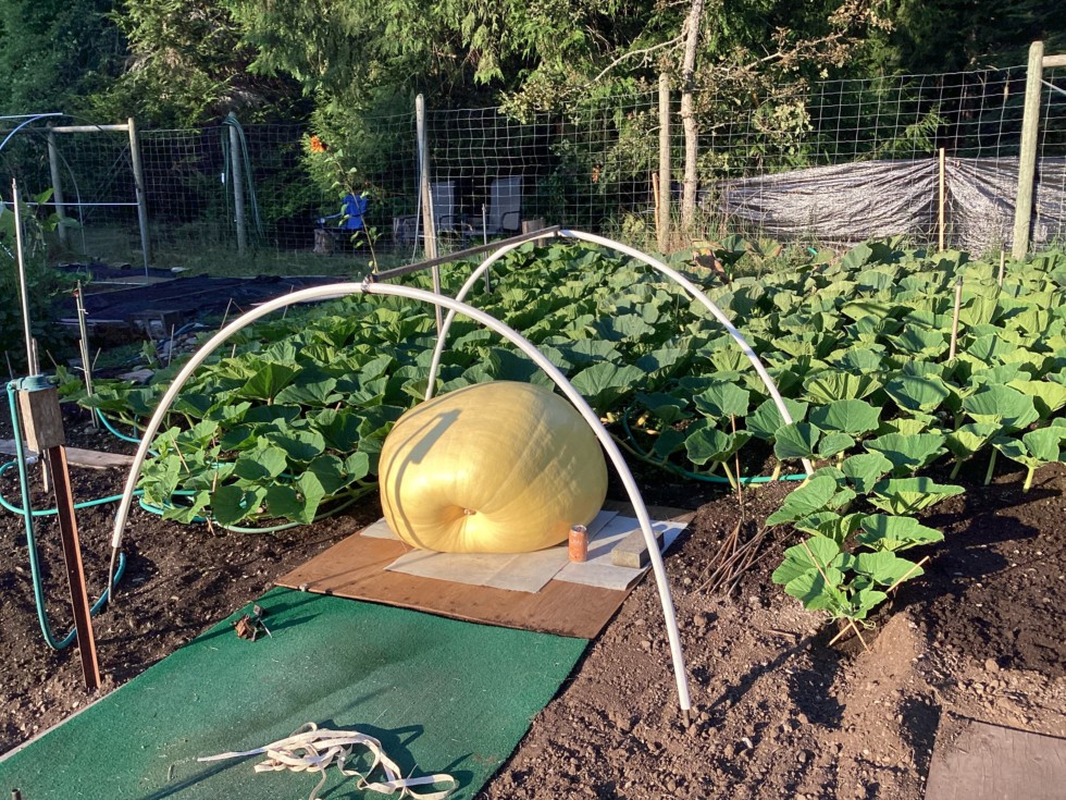 Glen, on the 1995.5 Hoornstra plant is Dap 30 today and comes in at 239 OTT, just short of 300 lbs. Yeah, of course I gotta move my hooptie cover a little bit and get it wrapped but so far we've had no rain and I swap out the white sheet if it gets wet from watering, so there's been no rush. Plants are still growing but also showing the signs of slowing down moderately. The Hoornstra plant still has the main vine growing and 7 secondaries, once all the secondaries are terminated we can let the main go as far as it wants. The Sandercock plant has the main vine terminated at the fruit but still has multiple secondaries on each side that are growing (albeit slowly) and will eventually fill its allotted space. It could be a sink/source issue on the Sandercock plant that is holding it back, but the plant was smallish at pollination and stalled shortly after and was in suspended animation for several weeks when our weather turned off in Juneuary.