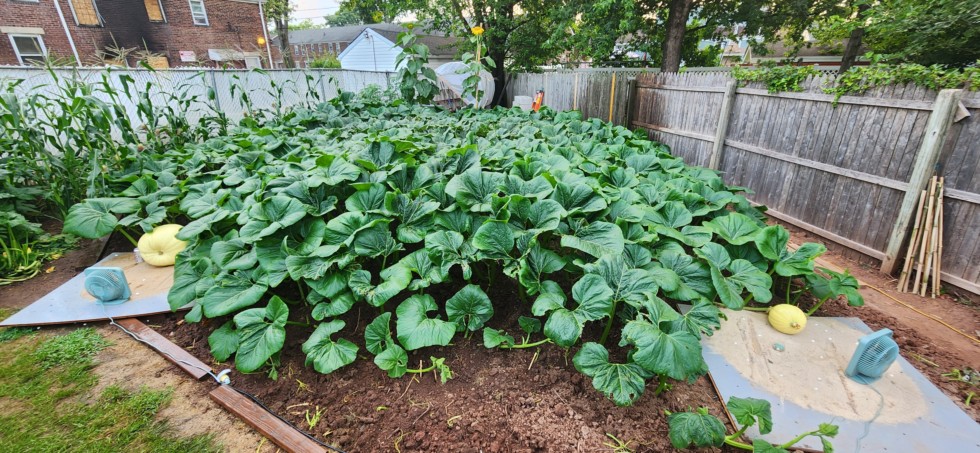 Good morning pumpkin growers I'm new here and this is my second year growing pumpkins. I live about 15 miles from New York City in New Jersey. I got a seed from Travis the Godzilla first one failed and he was nice to send me another and oh boy what a seed. Plant was very sluggish but it picked up steam with continuous efforts between weather hail winds and downpours plant looked like it was in a war zone. She battled it all and its still holding up. Burying and then unburying vines trying to minimize rot in this humidity was a torture in the heat. She's looking good I lost my main so i split the two secondaries and treating them as the mains trying to grow two pumpkins off one plant. She's almost filled in 650/700 SF. I need to come up with names.