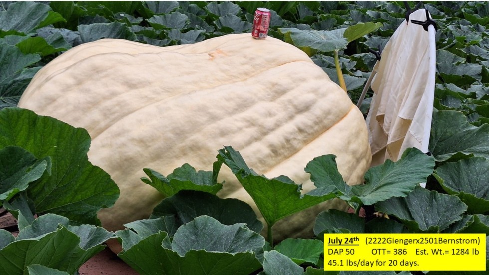 The 2222 x 2501 is still growing at a decent rate at DAP 50. Average wt gain = 45.1 lbs/day for the last 20 days. Taping 1284 lbs. Blossom end is slowly disappearing, Blossom nub was removed and the cut area, fan dried thoroughly last week, with 3% Hydrogen peroxide.