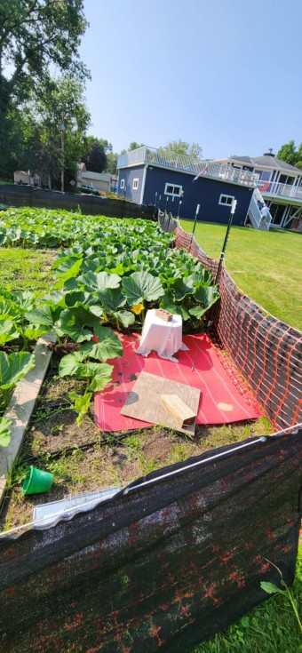 150 sq ft plant has just a little bit more to fill in. Probably would be filled if it weren't for a rabbit that recently developed a taste for pumpkin vines. The offender has been rehomed.