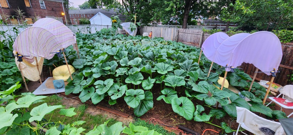 Correction was made DAP 22 days on the pumpkin on the right and DAP 15 on the smaller one on the left. Losing some leaves in the middle due to hail,wind,rain and now powdery mil dew. Losing other stems due to rot where they meet the soil. I've been cutting them off and having the fans do the work.