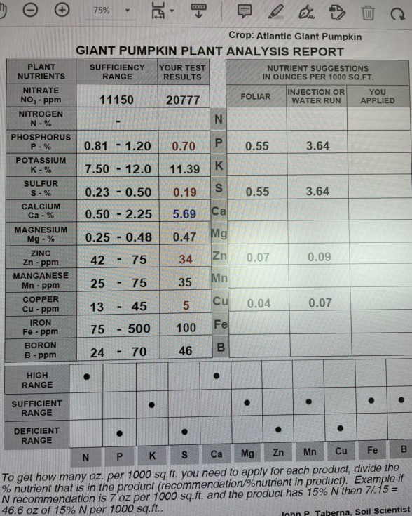 Tissue Test result is in for the 1908. I began dripping phosphorus a week ago a few days before sample collection. I'll have to add the other stuff to the mix. It's probably to late for it to have much affect, but we'll see. I going to research and ask questions about how high calcium concentration may affect plant/pumpkin growth. My patch has always had very high calcium soil concentrations. Not sure if I can do much about it. I'm glad to see the Mn and Mg levels are at least sufficient, since I've been trying to raise those levels up for the last 4 seasons. Boron was ok as well. I applied boron granular last season, but didn't want to over do it by adding more this season. Maybe after this season.