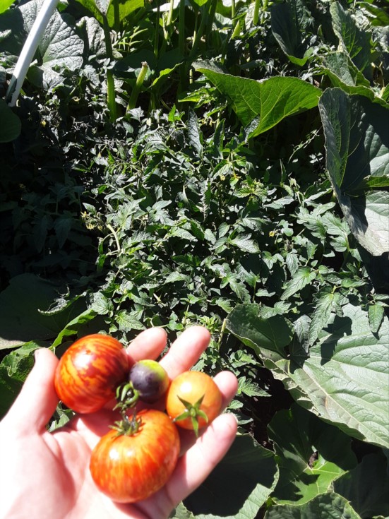 This was the very sick 'queen of the night' tomato plant from earlier this year. Beautiful striped tomatoes, not large though... A relatively tame plant, minimal pruning required and only modest production, it seems to be happily at home in the gourd and pumpkin leaves.
