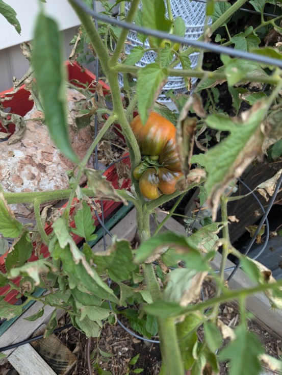 The megabloom tomato on the Cherokee purple is ready to pick. This thing looks like a monster. Too bad it's in miniature. It is an eating mater so it's been a bit neglected. It wasn't planted in the best spot either. I'll save the seeds from this one it has giant tomato plant qualities. Maybe I'll weigh it just for fun and to put something on the board for my team.