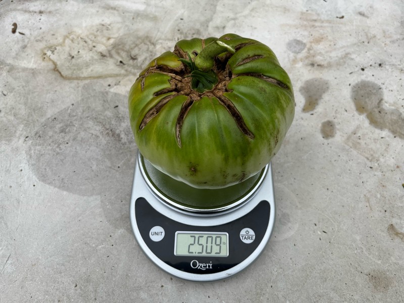 I was worried that this tomato was going to split open, so I picked it and got it on the scale. It measures 19� in circumference.