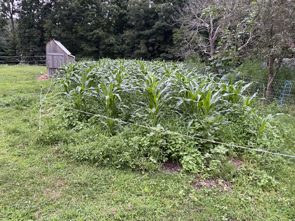 This corn was planted one month ago. Sweetcorn is just about the only thing that really thrives in this wet, humid, Sticky weather. It's got to be 3 to 4 feet tall already no tassels in sight.