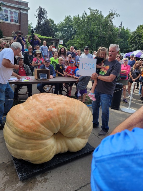 Well my gandaughter, little Miss Hayzlee and I pulled out a win at the Iowa State Fair with our Giant Pumpkin. Our personal best ever. 1,294 lbs. Congratulations to Pete Caspers and Alba Caspers with their 2nd place entry at 1,286 lbs and Don Young and Tommy Rhodes with their 3rd place entry at 1,002 lb pumpkin! They are great growers, but better yet, great friends.