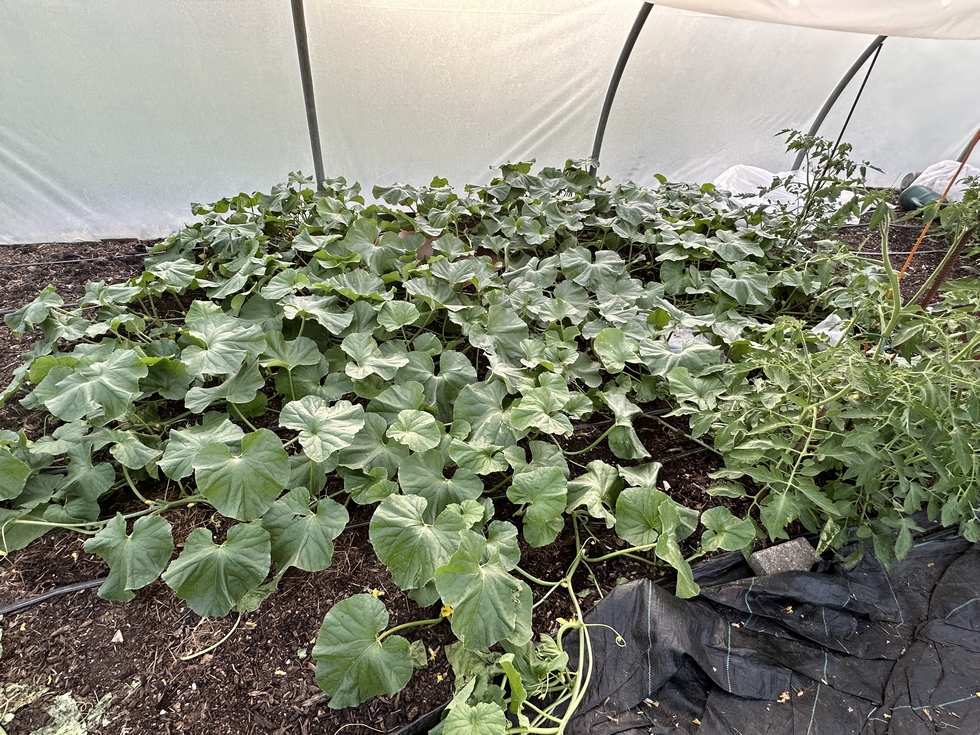 Cantaloupe plants a fair size now. Have pulled plants not yet set (as timing for end Sept show) to focus. Bit of job trying to trim tertiary growth shoots but trying. Two 76 plants and a 58 growing now.