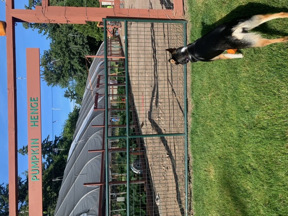 Cleo may be trying to figure out how to get in to my patch, but I'm trying to figure out how to get them (the pumpkins) out! Here is my process: 1. Lift the pumpkin with a tripod & then slide a piece of plywood underneath the pumpkin. 2. Put a super-pallet on the piece of plywood. 3. Use a pallet jack & about 4 people to move the pumpkin on a road of overlapping sheets of plywood to the giant, custom lift gate on my F550 12' flatbed pumpkin hauler. 4. Hope that the liftgate can lift the pumpkin!