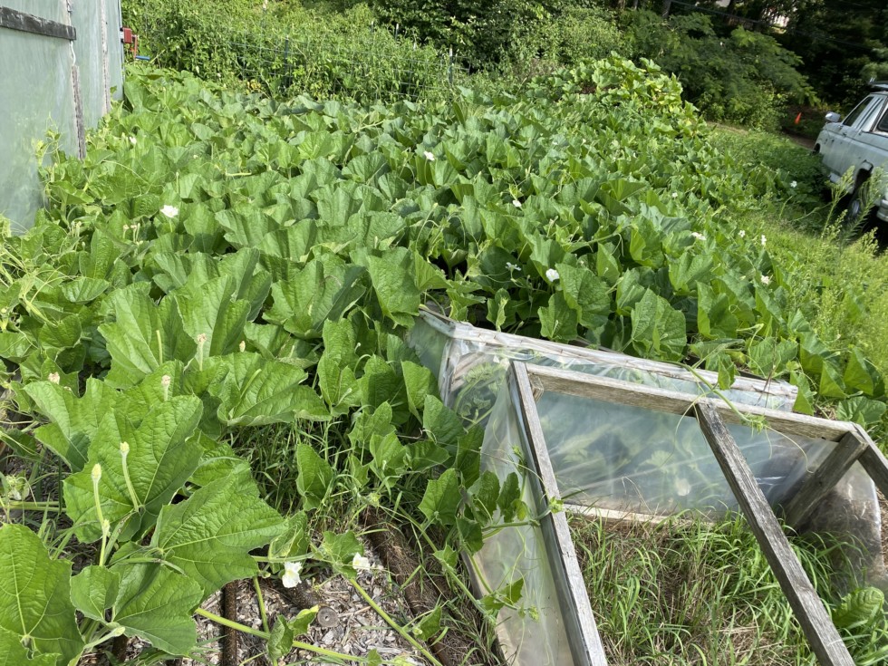 This is a photo of my bushelgourd that nearly died early in the season. It is now taking over my entire yard yet. I see very few bushel gourds on this plant. I have only found one so far far as a matter of fact. It is about the size of a volleyball so definitely a late start here.