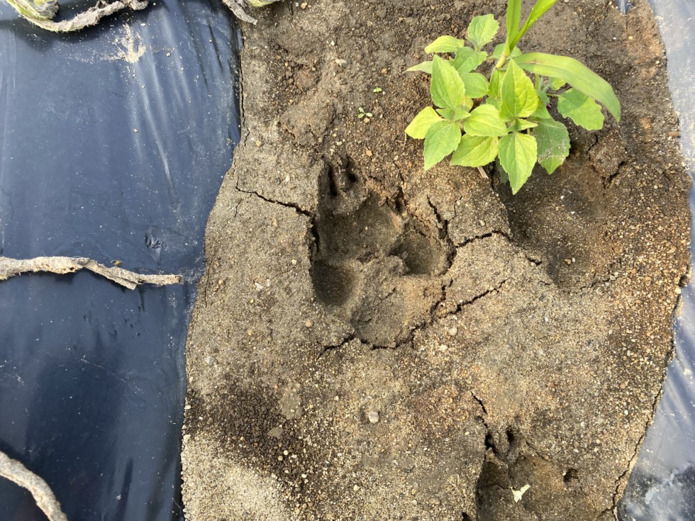 I saw these footprints one of my gardens that has my watermelons and cantaloupes right away. I knew it was A dog. This garden has an electric fence wire about 30 inches off the ground for deer,they must be going underneath it.