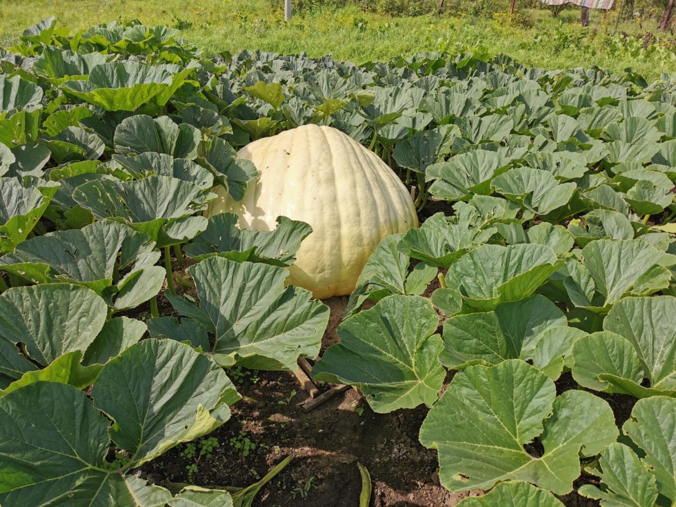 830.5 McMillin DAP 45 666 lbs. The pumpkin is almost white. This plant looked the worst after the hail. But now the pumpkin has grown a lot of new foliage and continues to grow actively. It is a pity that there is not much time left for rasta. The pumpkin could grow really big.