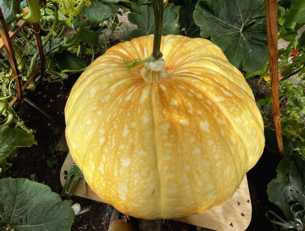 Inside the Scarlet Womb � I squeezed inside the pole bean tepee to take this shot of Amelia on Day 40. Amelia is starting to color up and rib out. She tapes just over 600 pounds OTT and growth has slowed down to 20lbs/day for the last 5. I'm actually relieved she's slowing down because she's starting to outgrow her 4' by 4' landing pad...