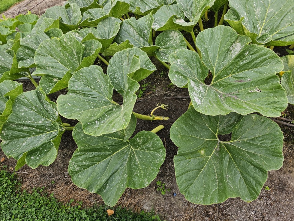On Aug 8 th I posted a picture of PM starting on the Barron 2144. The pumpkin went down to BES but I kept the plant growing as a testbed for this new fungicide called "Hygropunch". The leaf on the lower right was sprayed on Aug 8th when the picture was taken. 10 days later and the PM is gone! As you can see the other leaves are getting seriously infected.
