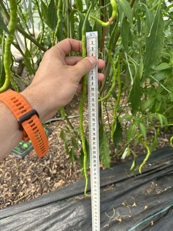 Long chilli coming along; I think some around 32cm (photo at angle). Have bean meaning to thin these chilli down to just a few per plant but concentrating on other things means it's a job I just didn't get around to (so far)