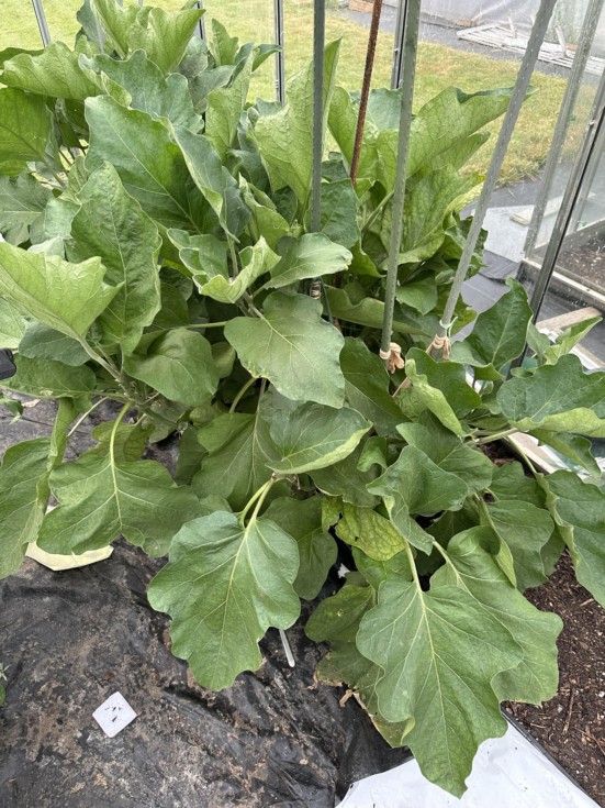 Aubergine (Eggplant) plants with a fair bit of foliage - it's more usual to trim to single stem but I let more stems grow. There are two plants here spaced about 3 ft apart