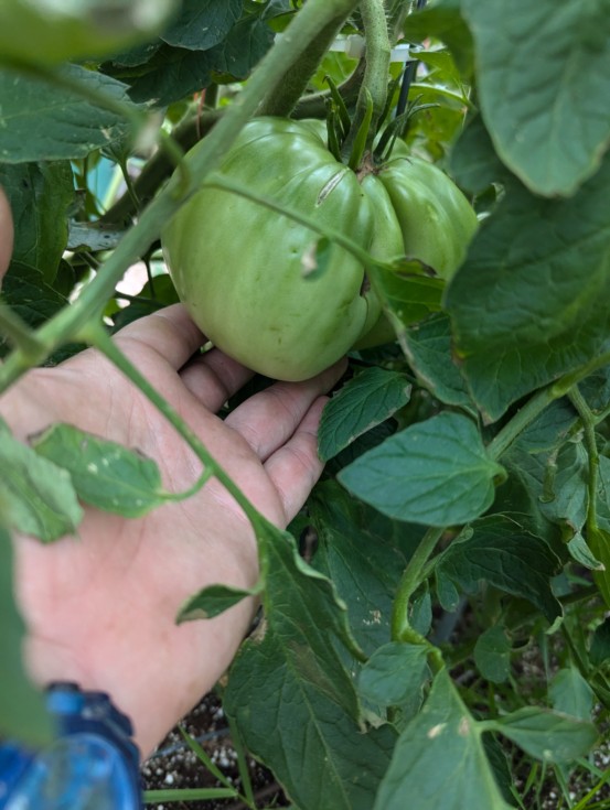 And as I was doing the plant thing I had a WTF moment. I only have 5 plants and I've been keeping pretty good track of them. I have a big single on the Brown plant as I wait for a late season mega. Well I went to cut a baby tomato off and found this crazy huge mater hiding in the leaves. It's almost the same size as the other one. What the heck. How can I miss something like this. Just craziness. So I have 2 15" maters on this plant.