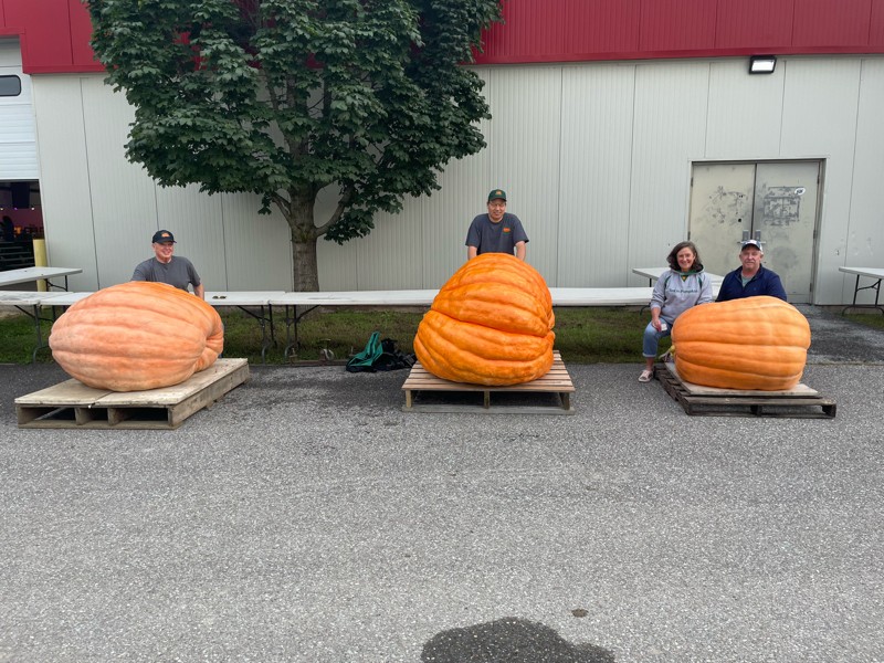 Here are the 3 pumpkins at the weigh-off. Wilbur Horton in the middle at 1327. Kevin Companion on the left at 1059.5. And us on the right at 624.