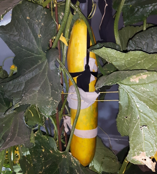 My giant cucumber on plant #2. The one on plant #1 looks about the same. I will be picking them on Monday, weighing them and then taking the heavier one to the IPE fair in Armstrong where I'm registered in the heaviest cucumber category. They will be displayed there for a week afterwards.