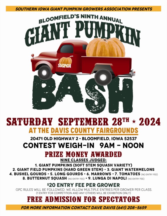 WE WILL START WEIGHING EXHIBITS AT 9 AM AND FINISH WEIGHING BY 12 PM. NO EXHIBITS WILL BE WEIGHED IF ARRIVING AFTER 12 PM. AWARDS WILL FOLLOW WEIGHOFF. ALL EXHIBITS WILL STAY AT SITE UNTIL 3 PM, THEN BE RELEASED FOR LOAD OUT AFTER 3 PM. WE WILL ALSO HAVE A GIANT PUMPKIN DROP ON THE GROUNDS. NO ALCHOL EVENT. HOWARD DILL AWARD (500 LB MINIMUM). GREEN SQUASH WEIGHED AGAINST AG'S THEN RECORDED GPC SQUASH.