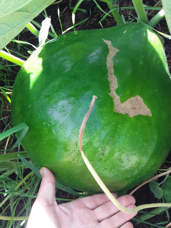 Ceiseilski plant is only around 40 sq ft this gourd has slowed the plant down to self termination because the gourd-to-plant ratio has been exceeded. The L was carved by a s-L-ug. That was part of this year's learning curve for me.