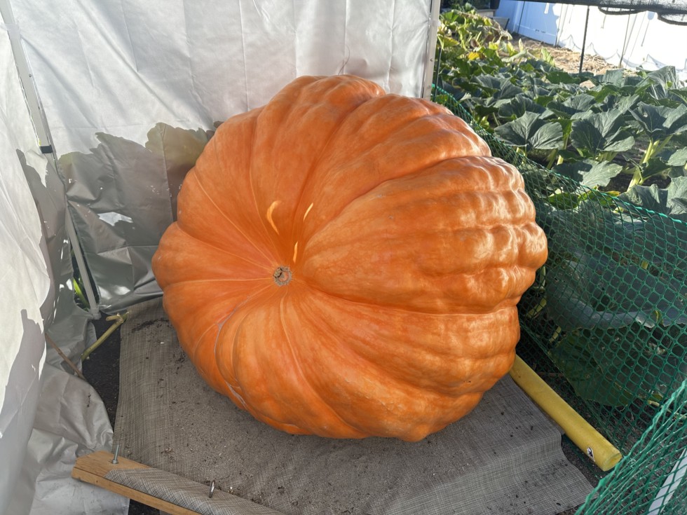Pictured is the 2023, and it's estimated at 1050 lbs. It's a pretty pumpkin from this side.
