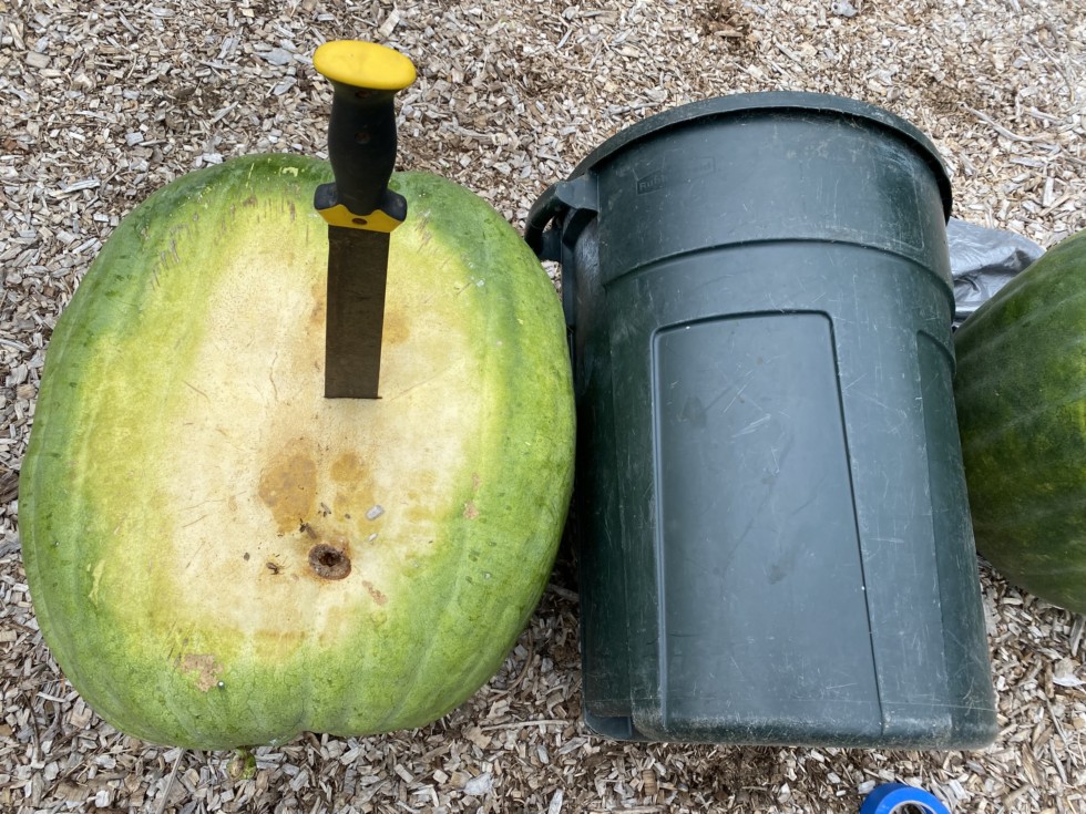 Unfortunately, when I flipped the melon over and looked at its underside, I found a soft spot that went to The flesh. So out came the machete.