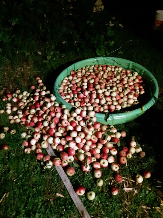 The apple tree thinks it can create more pie this year than any of the pumpkin plants. This is maybe 220 lbs. There's another 150 lbs still up in the tree. It may be correct.