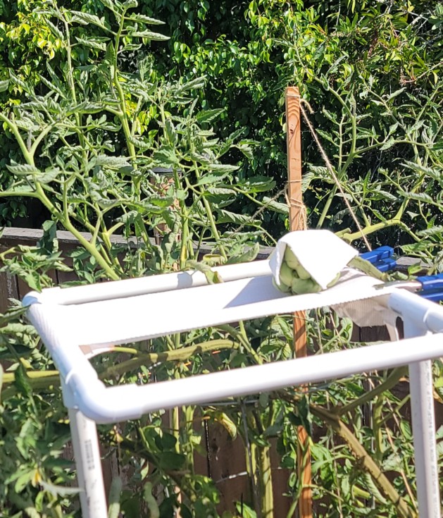 Was grilling last night and in-between burger turns, i did a walk around of my tomato plants. I found the 9.06 ribbon vine folded over with the fruit drooping. Talk about buzz kill. Looks like I waited a bit too long to give it support. The fruit is so high on the plant i had nowhere to hang a hammock, had planned on solving it Monday. Today, this is my solution... pvc & wide ace bandage. Truth be told, I've had very low expectations with this fruit. Although the ribbon stem is crazy wide, it's quite thin. I don't feel there's enough stem to support the 10+ fruits. Nonetheless, will try to take this one to redness & get seeds as the characteristic has massive promise.