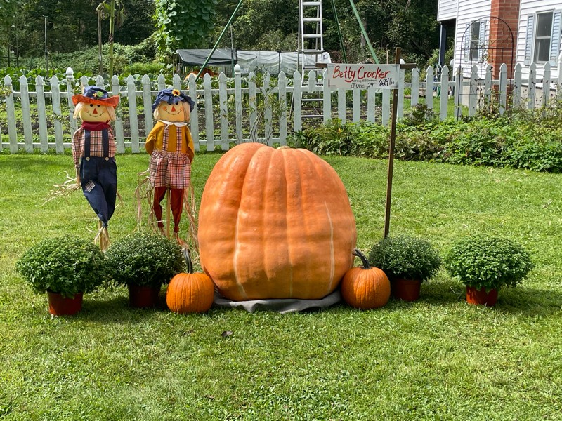 We started growing giant pumpkins in 1996 just for our front lawn display and all these years later it is still our primary reason to grow. Betty has returned from our local fair and is snuggled into her new role for the fall.