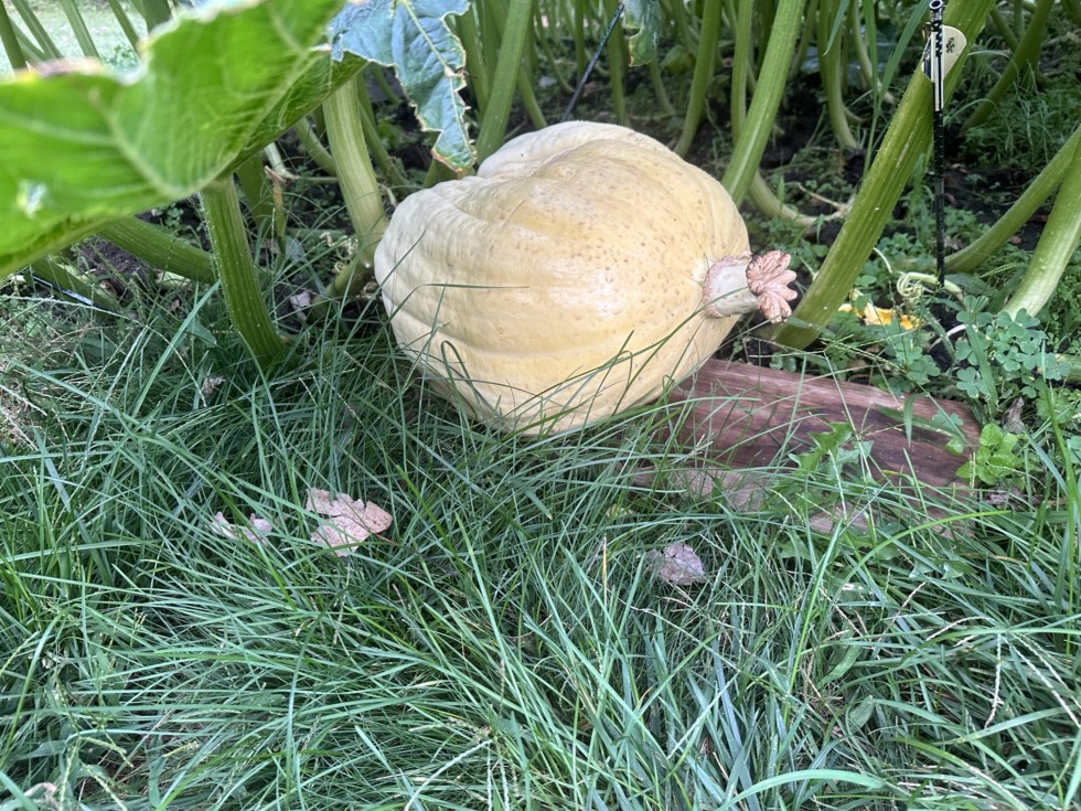 I decided to do something different (maybe even stupid) and set two additional pumpkins on my 2465 Sperry for additional crosses since it is a great plant. This one is a 2222 Gienger cross at about 27 dap and it hasn't slowed the big one down at all. Last week the temperature was 90 degrees with over an inch of rain, so maybe it even saved it from popping.
