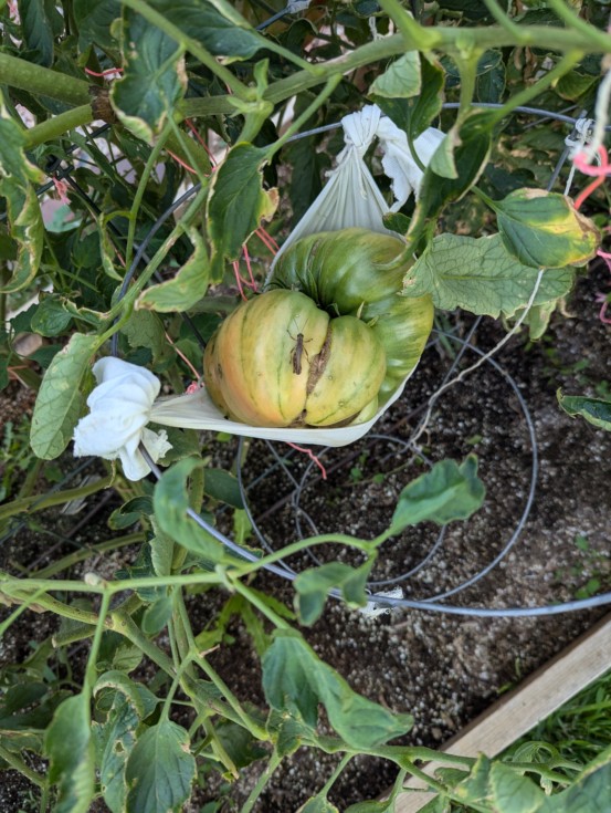The tomato on the 7.94 LaRue is blushing. It's a few days early but it will be weighed. Luckily the grasshoppers don't like to eat the maters.